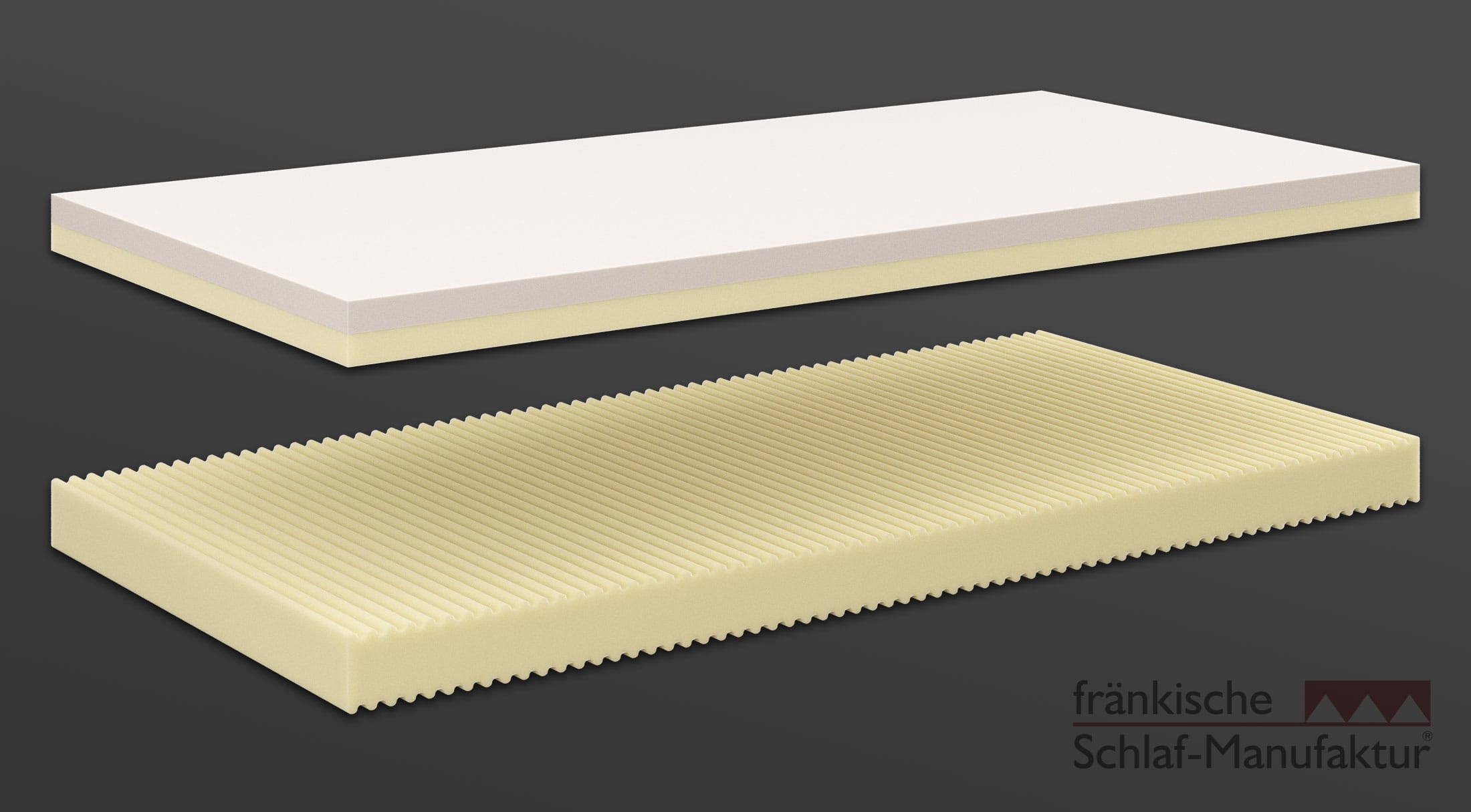 Die obere Schicht besteht aus 12cm hohem viskoelastischem Schaumstoff mit einem Raumgewicht von RG50. Diese Schicht reagiert auf Druck und Wärme, passt sich Ihrem Körper perfekt an und bietet Ihnen eine optimale Liegeposition. Dank der Einschnitte zwischen den Schichten erleben Sie eine gezielte Unterstützung an den richtigen Stellen und dazu noch die Optimale Belüftung.